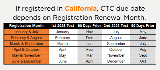 Your registration renewal date determines when your periodic Clean Truck Check inspections are due. Inspections may be completed up to 90 days prior to each due date. Please do not complete testing earlier than this window, as CARB will require a second inspection within the 90-day period for the results to be accepted, the vehicle to pass, and a compliance certificate to be issued.