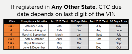 - Phase 3 (2026-2027): Enforcement and fines sent to fleets who have not complied with the periodic testing schedule. Bi-annual testing and fees still required.